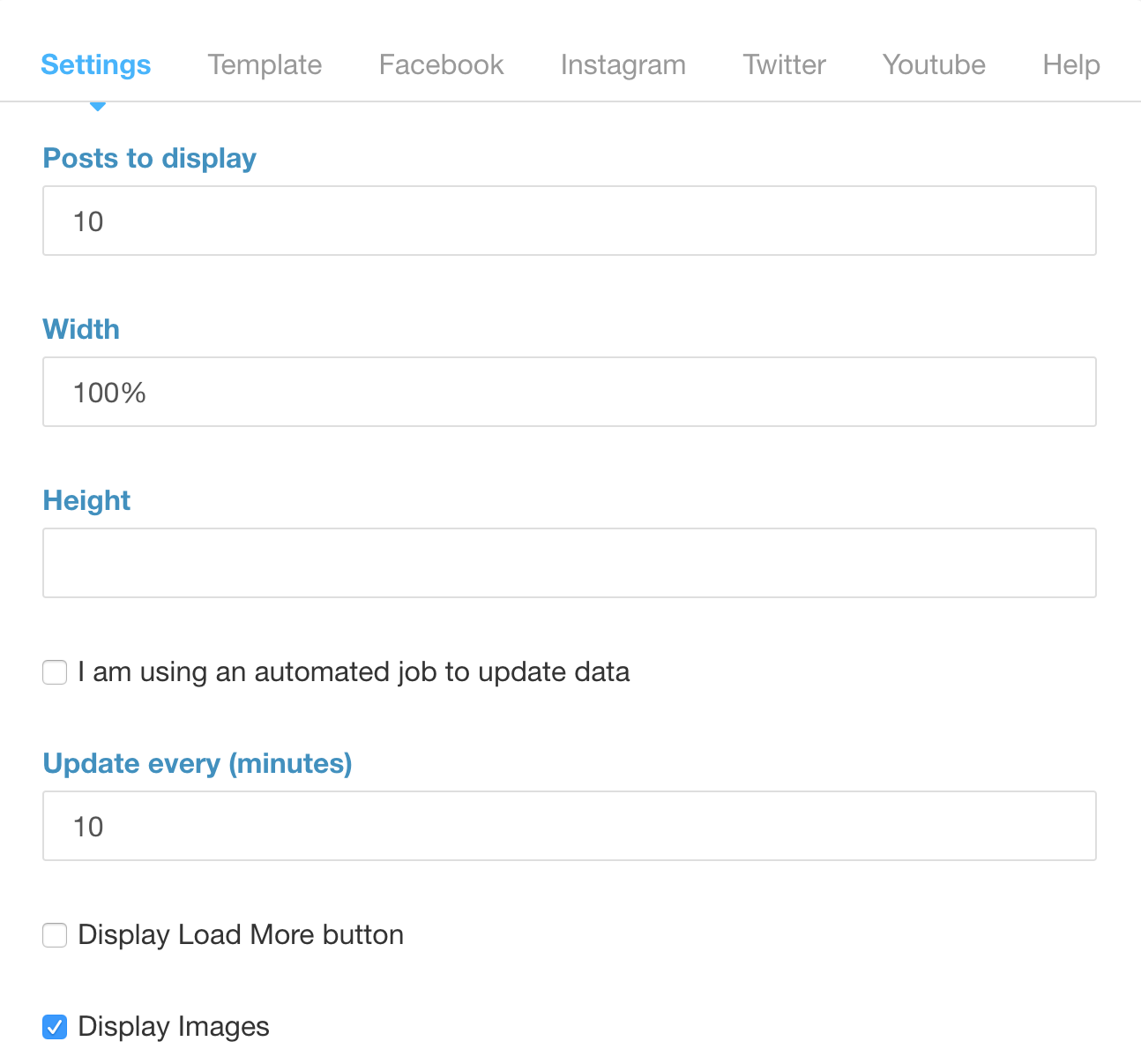 Update every (minutes) - option only available if automated job is not selected. Once user loads your website, a plugin will automatically check if it's time to fetch new data from social websites